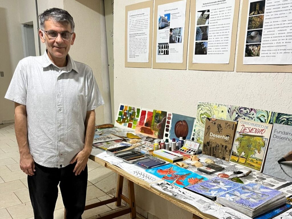 César Teixeira em mesa demonstrativa de sua oficina de Desenho e Técnicas de Expressão