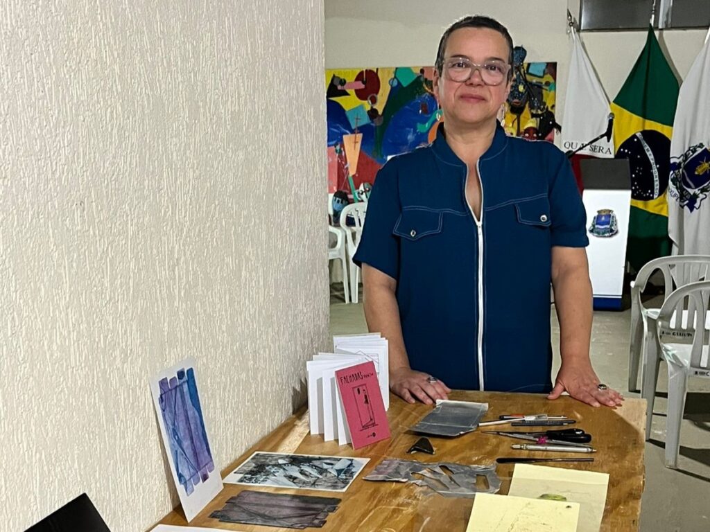 Gabriela Rangel expondo materiais e processos da oficina Técnicas alternativas em gravura.