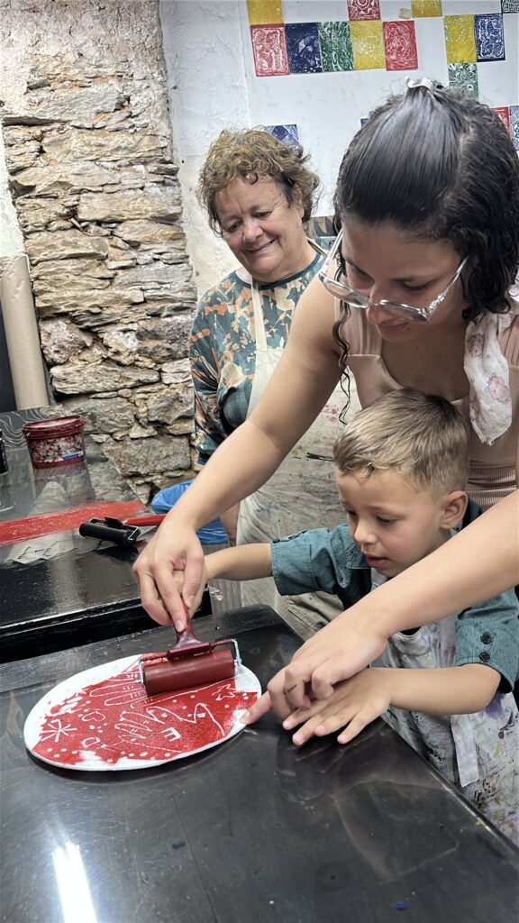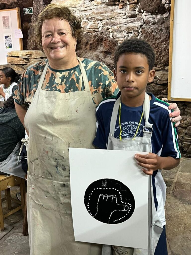 Dessa forma, para atender os alunos da Educação Infantil e do Ensino Fundamental, foi oferecida a Oficinas de Isogravuras para as duas turmas, ministrada pela artista e professora Ana Fátima Carvalho, pela manhã com o 5° no e a tarde com a turma do 1° período acompanhados de mães e pais, sob o tema “As mãos e o que elas podem fazer”. A técnica de isogravura permitiu aos estudantes explorar a coordenação motora e a expressão artística. “Trabalhamos com a importância das mãos, em um projeto lindo. A empolgação das crianças era contagiante. Eles desenhavam as mãos sobre o isopor e tiravam cópias na Prensa de Gravura. Foi um dia de aventura para as crianças e para mim também”, contou Ana Fátima.