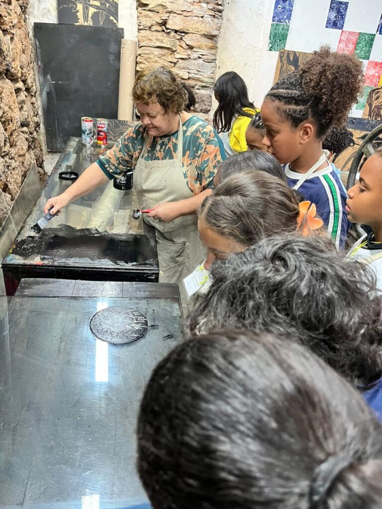 Alunos da Escola Municipal Monsenhor João Castilho Barbosa, de Ouro Preto, participaram de oficina de isogravura que integrou o projeto interdisciplinar da escola, intitulado “Mãos que Aprendem, Mãos que Ensinam, Mãos que se Completam”. A ação aconteceu em no Núcleo de Arte e Ofícios da Faop e reuniu arte e pedagogia.